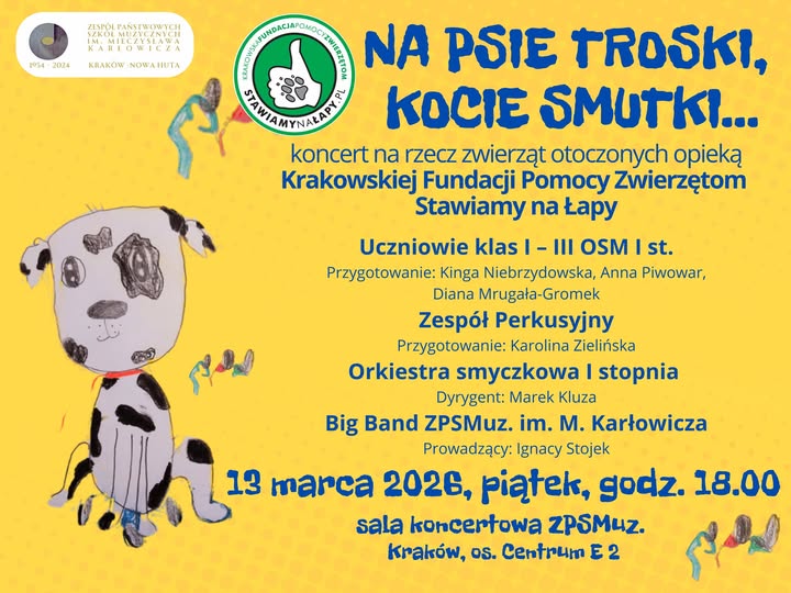 Serdecznie Was wszystkich zapraszamy na koncert charytatywny organizowany dla Fundacji Stawiamy na Łapy w Szkole Muzycznej im. Mieczysława Karłowicza w Nowej Hucie na os. Centrum E 2.