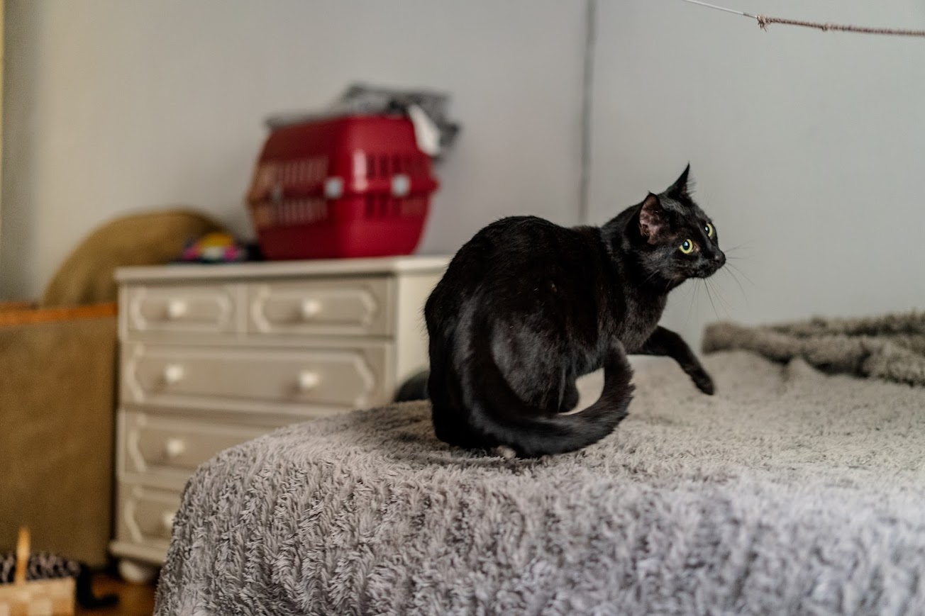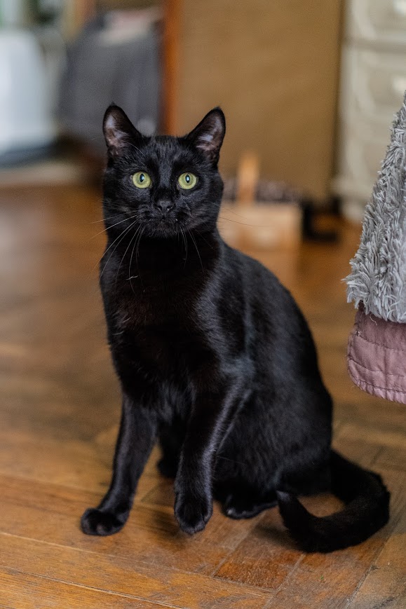 Odkąd się zrobił odważniejszy, to też chętnie z nami rozmawia – a to przypomina, że nie jadł nic od stu lat, a to informuje, że fajnie by się było teraz pobawić. Najczęściej jednak poluje na Cyzia lub siedzi w kartonie.