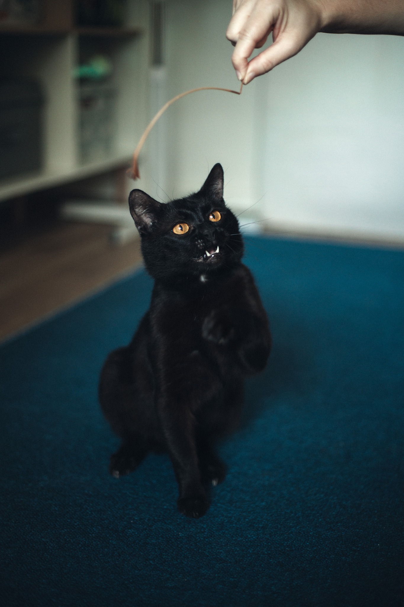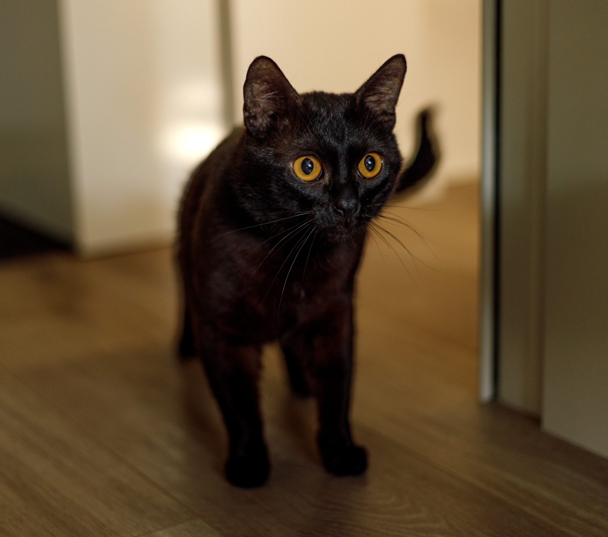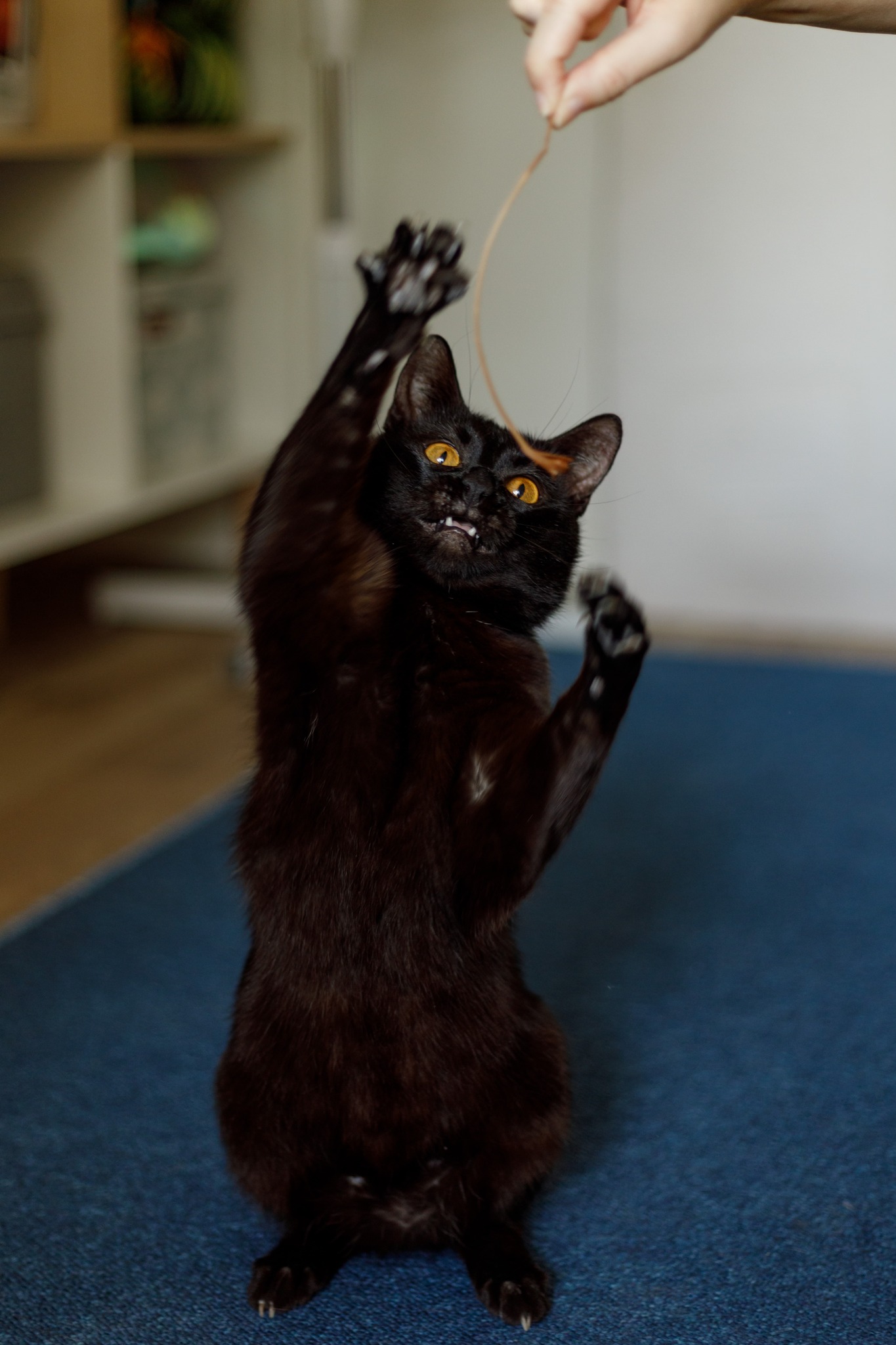 Lucek to młody kocurek, cały czarny, z maleńką, białą krawatką na gardle i pięknymi, bursztynowo-żółtymi oczami. Zdrowy i wykastrowany. Jest kotem aktywnym, ale lubi też długie drzemki w swoich ulubionych miejscach. Ulubionymi zabawkami są… patyczki przyniesione z podwórka, czasem plastikowa piłeczka i sprężynka, sznurówka i rybka z walerianą. To kotek lubiący okazywać czułości – często barankuje i się łasi. Lubi być czasem brany na ręce (jak tego chce to mocno kręci się wokół ludzkich nóg). Coraz częściej docenia spanie na ludzkich kolanach, choć nigdy nie jest na nich przesadnie długo. Lubi być jednak blisko człowieka, często za nim podąża. Ma dobry apetyt, ulubione karmy są z kurczakiem, czasem rybą (nie przepada za wołowiną). Od początku bezbłędnie korzysta z kuwety. Obecnie mieszka z kocią siostrą – on bardzo jest nią zainteresowany, widać, że chciałby się zaprzyjaźnić, ale drugi kot nie odwdzięcza się tym samym zainteresowaniem. Lucek może być zaadoptowany samodzielnie (wtedy trzeba będzie mu poświęcać więcej uwagi na zabawę), ale świetnie nadałby się też do dokocenia, szczególnie w domu z drugim, aktywnym kotem. Początkowo boi się nowych osób, ale łatwo można wygrać jego serce zabawą i spokojnym podejściem. Jest też dość ciekawski. Lubi być głaskany, ale czasem go to nakręca – jak jest przebodźcowany, może z przejęcia syczeć lub zamachnąć się łapką – nie jest to jednak przejaw agresji. Jednakże z tego względu nie polecałabym go do adopcji do domu z małymi dziećmi, a jeżeli z dziećmi to takimi, które nauczą się odczytywać sygnały, kiedy kota należy przestać dotykać. Ogólnie to bardzo miły i zabawny kot!