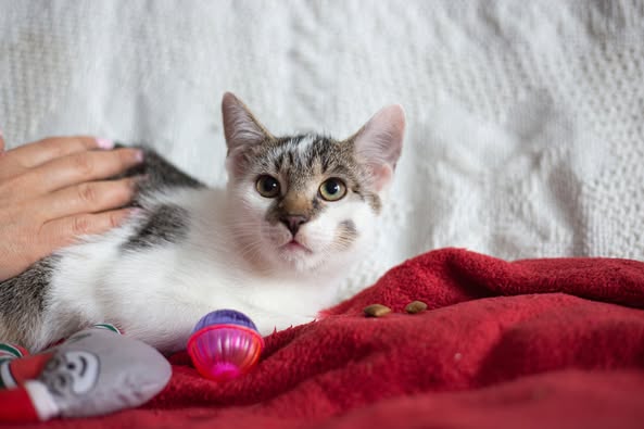 Jest przeuroczy. Uwielbia głaski. Można go brać na ręce. Bawił się pięknie wędką i innymi zabaweczkami. Wydaje śmieszne dźwięki i uciekając kładzie się na boczek przechylając głowę i ocierając się o coś. Jest przy tym przezabawny.